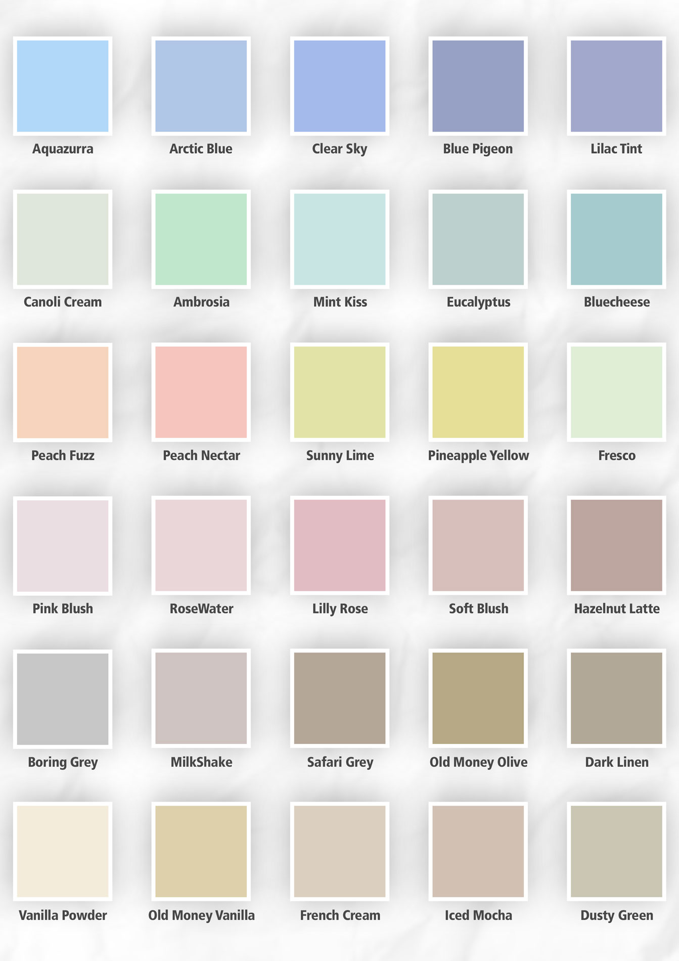 Culoare Variante disponibile: Aquazurra, Arctic Blue, Clear Sky, Blue Pigeon, Lilac Tint, Canoli Cream, Ambrosia, Mint Kiss, Eucalyptus, Bluecheese, Peach Fuzz, Peach Nectar, Sunny Lime, Pineapple Yellow, Fresco, Pink Blush, RoseWater, Lilly Rose, Soft Blush, Ha